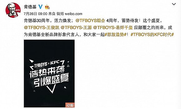 似乎沒(méi)有什么中國(guó)品牌像肯德基那樣擁有如此陣容強(qiáng)大的代言人。2016年肯德基簽下鹿晗與李宇春,而7月26日它又在自己的官方微博上宣布TFBOYS成為自己的最新代言人。5個(gè)月前,肯德基還簽下了薛之謙。