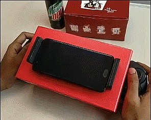 游戲盒子的主體就是肯德基爺爺熱賣的炸雞…盒子,藍(lán)牙手柄位于盒子兩側(cè),盒子頂部有手機(jī)固定裝置,不過這個(gè)裝置不僅可以固定手機(jī)還可以固定汽水瓶,聯(lián)想到 Mountain Dew 是百事可樂旗下的一個(gè)飲料品牌,就很好理解了。