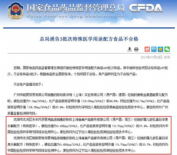 沈陽市沈河區(qū)米米氏孕嬰用品店、沈陽市沈河區(qū)新新家妮母嬰用品店銷售的,標(biāo)稱由上海雀巢產(chǎn)品服務(wù)有限公司(原產(chǎn)國:荷蘭)經(jīng)銷的“藹兒舒”乳蛋白深度水解配方(特殊醫(yī)學(xué)),硒檢出值分別比產(chǎn)品包裝標(biāo)簽明示值(0.7微克/100千焦)低37.4%、33.7%。