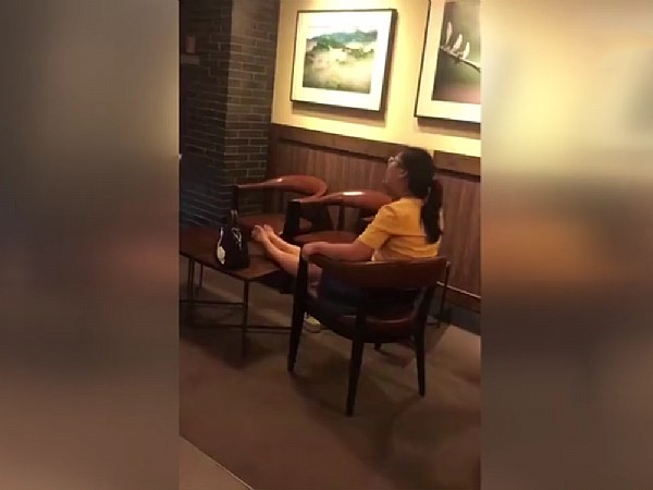 視頻中,一位年輕女子將光腳搭在咖啡店的餐桌上,并持續(xù)辱罵一名抱著孩子的顧客,甚至多次向其吐口水。
