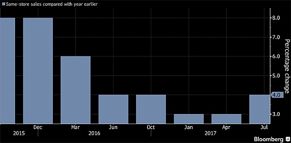 全球的同店銷售增長為 4%,高于上季度的 3%,但依然沒有實現凱文·威爾遜所說的恢復至 5% 的目標,也低于華爾街預期的 4.9%。