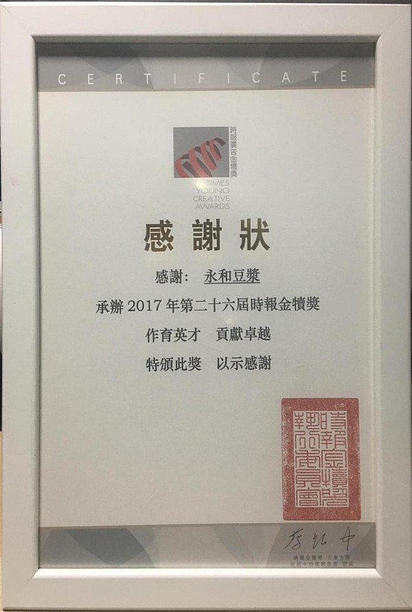 金犢獎組委會贈予永和豆?jié){感謝狀