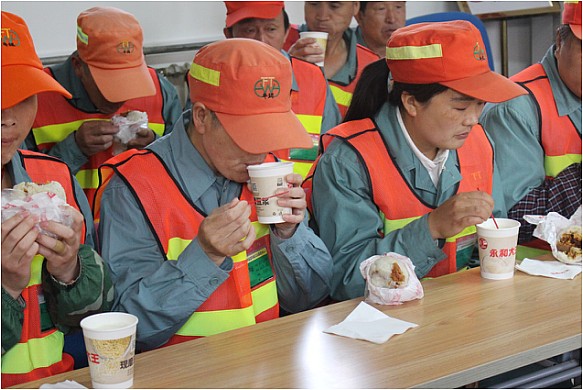 永和大王的工作人員和我們的愛心志愿者正在將熱氣騰騰的早餐分發(fā)給環(huán)衛(wèi)工人們,并向他們表示問候。
