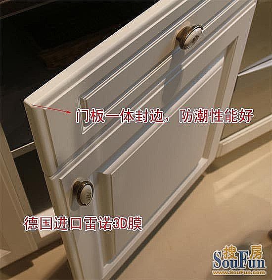 此款櫥柜是進(jìn)口模壓門板,18mm奧地利進(jìn)口E1級環(huán)保板材,表面采用德國進(jìn)口雷諾的3D膜,厚度是國產(chǎn)膜的40倍,色澤光亮,光感非常柔和細(xì)膩,表面舒適感強(qiáng)。門板一體封邊,整體效果美觀、高檔,防潮性能比較好。
