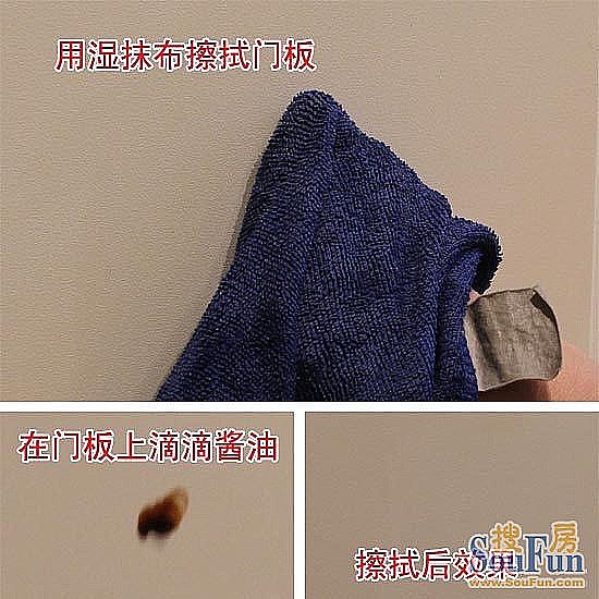 現(xiàn)場導(dǎo)購員在門板表面滴上醬油,稍等片刻用濕抹布擦拭,擦拭后表面看不出任何污漬。可見,門板防污性比較好,易于日常打理。