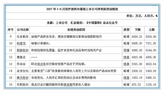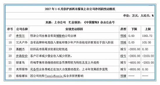 據(jù)監(jiān)測數(shù)據(jù)顯示,截止2017年5月11日,滬深兩市已有23家服裝上市公司公布了2017年上半年的業(yè)績情況,其中,得益于休閑裝業(yè)務(wù)的持續(xù)提升、兒童業(yè)務(wù)穩(wěn)定增長及互聯(lián)網(wǎng)業(yè)務(wù)的快速發(fā)展促進了自身的業(yè)績增長。森馬服飾預(yù)計今年上半年實現(xiàn)凈利潤5.12億元-6.66億元,凈利潤超億元的還有搜于特、跨境通、匯潔股份和七匹狼。