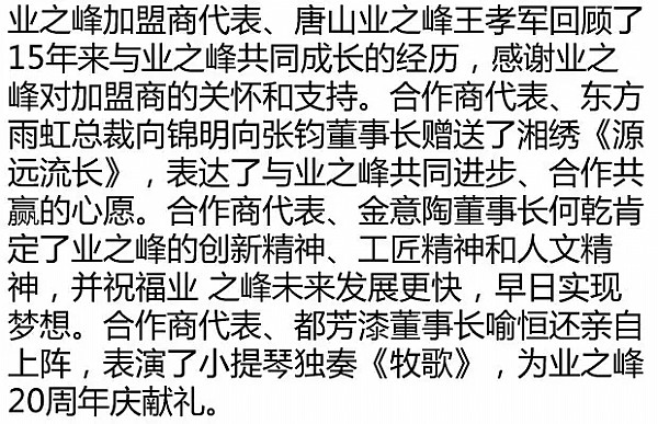 隨著《流金歲月》環(huán)節(jié)的到來,本次慶典逐漸進(jìn)入高潮。在主持人王凱、徐利農(nóng)的引導(dǎo)下,曾經(jīng)的業(yè)之峰人上場(chǎng)重聚,講述當(dāng)年的故事,未到場(chǎng)者也送來文字的祝福。 為了表彰功勛,業(yè)之峰分別為服務(wù)15年、20年以上的老員工頒發(fā)了獎(jiǎng)牌、證書和獎(jiǎng)品。獲獎(jiǎng)?wù)弑硎荆跇I(yè)之峰,自己不但收獲了財(cái)富,而且學(xué)到了知識(shí)和本領(lǐng), 把青春交給業(yè)之峰,自己無怨無悔。
