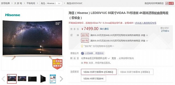 首先筆者為大家?guī)淼氖沁@款海信55英寸曲面液晶電視,該機搭載海信自主知識產(chǎn)權(quán)Hi-view畫質(zhì)引擎芯片,NTSC廣色域高達85%,配合HDR高動態(tài)4K顯示,還原自然本色。目前這款海信LED55V1UC曲面電視在京東商城促銷7499元,感興趣的朋友不妨關(guān)注一下。