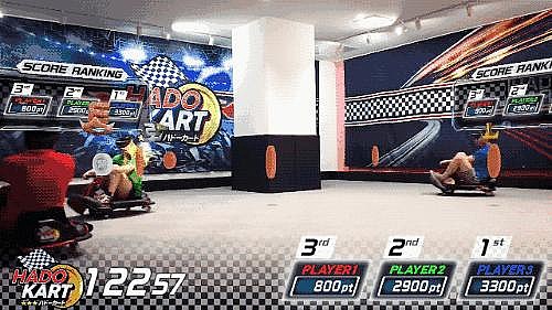 這個AR卡丁車體驗項目名為Hado Kart,搭配微軟的HoloLens,現(xiàn)場多人在同一個空間競技搶奪金幣,玩法類似跑跑卡丁車。通過HoloLens可以看到漂浮在空中的金幣或者炸彈等其他道具,如果收集到的是炸彈,這個人之前搜集的金幣將全部散落,在規(guī)定的時間內金幣最多者獲勝。