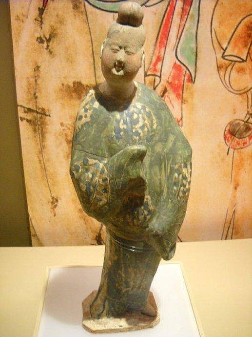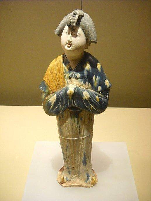 博文中展示的是唐代時期的“彩繪三彩釉女子陶俑”。唐朝婦女愛美,特別注重發(fā)式新奇與面部修飾。這一時期婦女的發(fā)式主要有半翻髻、雙環(huán)望仙髻、囚髻、拋家髻、驚鵠髻、螺髻、百合髻、圓鬟髻等。發(fā)式之上插飾各種珠翠花釵、步搖、梳子之類。為追求新奇之美,唐代婦女常創(chuàng)造出新的發(fā)式,有的高出面部兩倍以上,楊貴妃為標新立異,竟以假髻為飾。