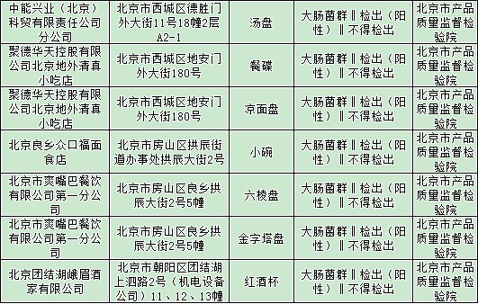 根據(jù)抽檢公告,北京食藥監(jiān)局在北京綠茵閣餐廳抽檢的湯碗、粥碗、肉餅盤,不合格項目為大腸菌群,經(jīng)檢測實測值為陽性,標準值規(guī)定為不得檢出。同樣,在在北京公益橋慶豐包子鋪抽檢的油條盤、餃子盤、小料碟、涼菜碟、粥碗;在中能興業(yè)(北京)科貿(mào)有限責(zé)任公司分公司抽檢的花邊方盤、湯盤;在聚德華天控股有限公司北京地外清真小吃店抽檢的餐碟、涼面盤;在北京市爽嘴巴餐飲有限公司第一分公司抽檢的六棱盤、金字塔盤;在北京團結(jié)湖峨眉酒家有限公司抽檢的紅酒杯;上述不合格項目均為大腸菌群,經(jīng)檢測實測值為陽性,標準值規(guī)定為不得檢出。