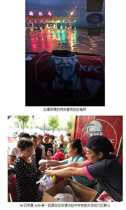 陜西綏德縣、子洲縣7月26日發(fā)生的特大洪水災(zāi)害牽動(dòng)社會(huì)各界的心。27日晚,肯德基西北公司連夜組織榆林、西安地區(qū)物資前往馳援,共計(jì)11500個(gè)面包和10000瓶礦泉水,已于28日運(yùn)達(dá)兩縣并發(fā)放給當(dāng)?shù)厥転?zāi)群眾。