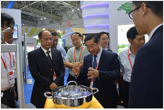 圖為:福建金源泉科技發(fā)展有限公司董事長(zhǎng)徐道華向福州市副市長(zhǎng)阮孝應(yīng) (左一)介紹金源泉的功能鍋具。