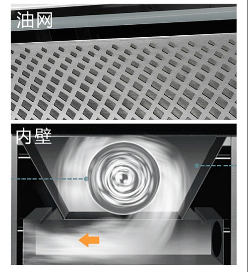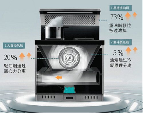 \u00A0\u00A0\u00A0\u00A0\u00A0\u00A0 油煙經(jīng)過油網(wǎng)、漏斗負(fù)壓腔、大直徑風(fēng)輪的三重分離,實(shí)現(xiàn)產(chǎn)品風(fēng)輪5年免拆洗。
