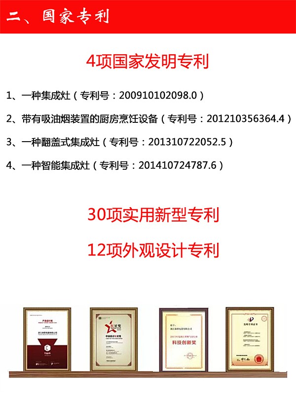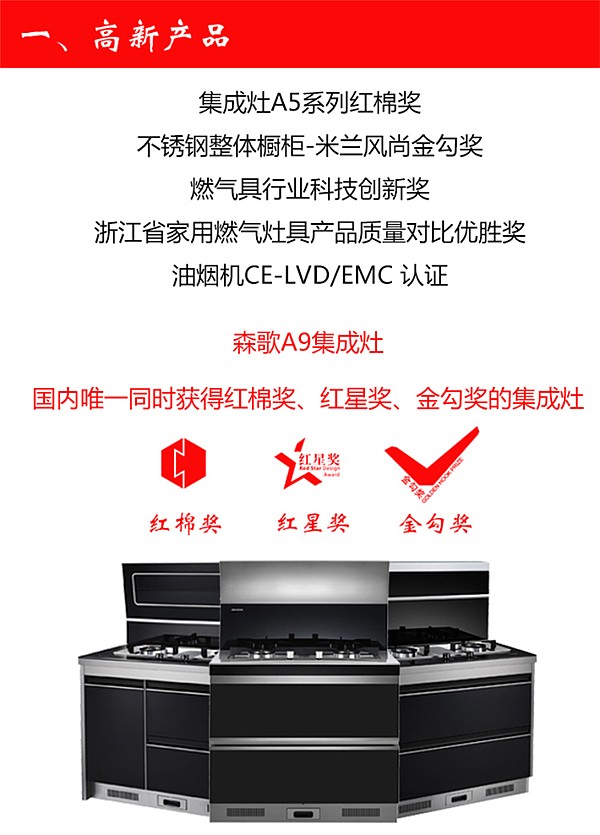 \u00A0 \u00A0 \u00A0 \u00A0森歌創(chuàng)始至今,榮獲“四項集成灶發(fā)明專利”、“高新技術企業(yè)”、“浙江名牌產品”、“浙江省知名商號”等榮譽。 是同時獲得“紅棉獎”、“紅星獎”、“金勾獎”三大獎項的唯一一家集成灶企業(yè),眾多獎項的獲得使森歌成為行業(yè)中的翹楚。\u00A0