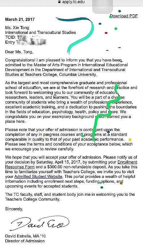 當(dāng)?shù)弥爱厴I(yè)后有申請(qǐng)哥大的研究生意向時(shí),Anne很慷慨的說:“我給你寫推薦信。”她還特意在推薦信的信封上寫上了“從今以后,你是哥大人”9個(gè)字,這給了當(dāng)時(shí)還沒有正式申請(qǐng)的童馨很大的信心。