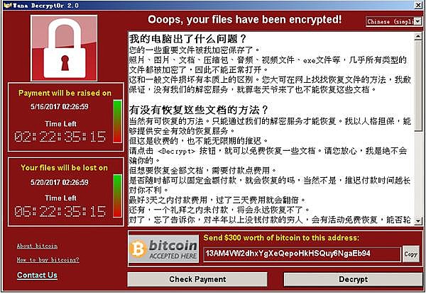 被感染的機器屏幕所顯示的告知付贖金界面。