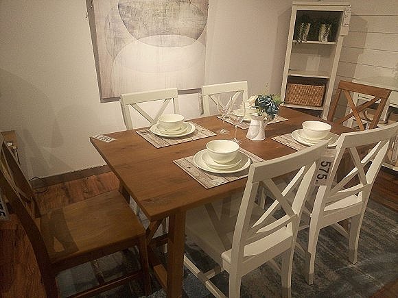 中心區域則聚集著大量木制餐桌,擺放整齊,好似飯館,周圍有少量稀疏的人在挑選,相比樓下,這一層的人氣要淡了很多。