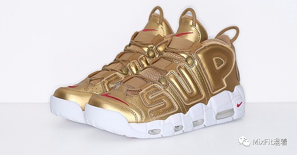 當然不能忘記這兩款配色的Supreme x Nike Air More Uptempo了。一雙是公演時穿著的金色,一款是拍攝節目宣傳照時穿著的紅色。