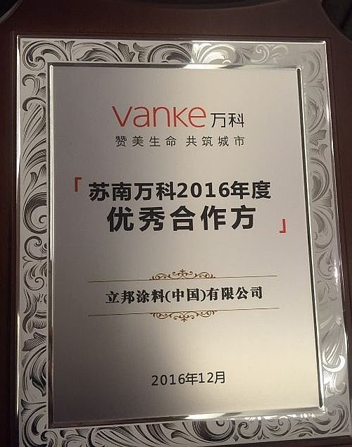 立邦憑借整體強大的服務(wù)系統(tǒng),包括前期針對設(shè)計部門的專題研討會、中期施工指導(dǎo)以及后期的項目回訪追蹤,立邦順利完成了“無錫萬科金域緹香、蘇州萬科新都會、揚州萬科金色夢想”等項目,獲評蘇南萬科2016年度優(yōu)秀合作方稱號。