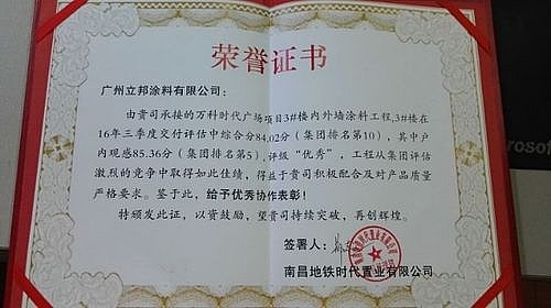 立邦承接的萬科時代廣場項目3#樓內(nèi)外墻涂料工程,交付評估綜合得分集團排名第10,其中戶內(nèi)觀感集團排名第5,評級“優(yōu)秀”,工程從集團評估激烈的競爭中取得如此佳績,得益于立邦積極配合及對產(chǎn)品質(zhì)量的嚴格要求,鑒于此,南昌萬科授予立邦優(yōu)秀協(xié)作表彰