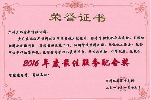 立邦在2016年萬科雙月灣項目施工過程中,主動協(xié)助解決現(xiàn)場問題,及時安排現(xiàn)場交底;協(xié)調(diào)材料進場,保證施工進度,特授予立邦2016年度最佳服務(wù)配合獎。