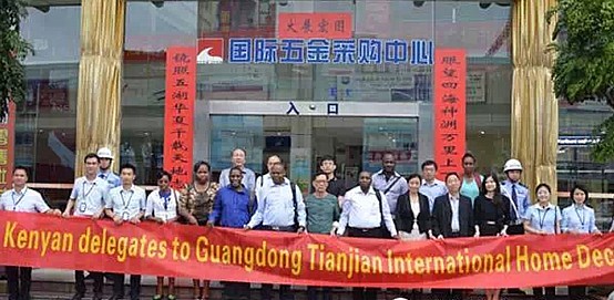 公司領(lǐng)導(dǎo)和肯尼亞代表團(tuán)在國際五金采購中心A座前合影