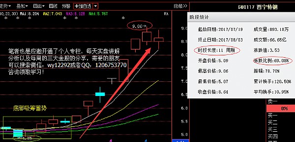 西寧特鋼600117這只股票可能近期才關(guān)注皓宇專欄的朋友沒有來得及把握到,老粉絲朋友應(yīng)該都是收獲了這一大波69個點的收益,同樣是底部吸籌蓄勢完畢之后,7.19日出現(xiàn)金叉在專欄上選出此股,11個周期的漲幅已經(jīng)高達(dá)69%。這就是長期關(guān)注了本人專欄的粉絲朋友們所能獲得的利潤空間。以上兩只股票都是出現(xiàn)了回調(diào)的情況,抓住的朋友不用擔(dān)心,后期詳細(xì)的操作都會在專欄上持續(xù)講解,及時添加筆者薇釁呺:【wy12292】或者Q:1206753770\u00A0查看。