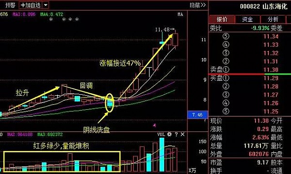 從圖中可以看出,山東海化從底部經(jīng)過一波拉升之后,開始下跌調(diào)整,而在17號受大盤影響,股價一下子回踩至成本線附近時,而此時量能明顯沒有放大,莊家作盤意味明顯。所以志文及時在專欄中給大家講解,短短的10個交易周期漲幅也是高達47%。相信看到專欄講解的朋友都是抓住了這波收益。