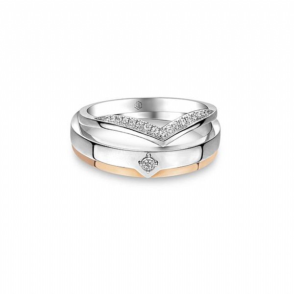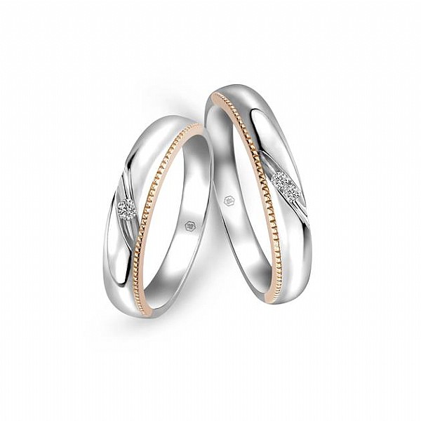 鉆石戒指上起伏的線條象征著愛侶間的愛情經(jīng)歷,隱藏在戒圈內(nèi)壁的鉆石恒久璀璨,低調(diào)地綻放出羨煞旁人的光芒。紅白分明的色調(diào)為新人添上幾分時(shí)尚魅力,鉆石在女裝戒指的弧線上整齊排列,在18K金相映下更具層次感。