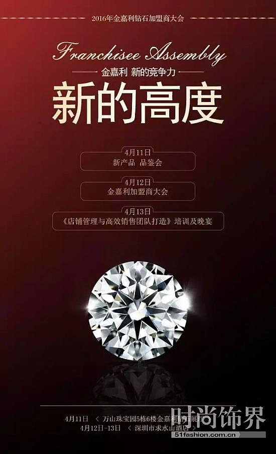 2016年金嘉利鉆石加盟商大會將于2016年4月11日-2016年4月13日在深圳盛大召開。