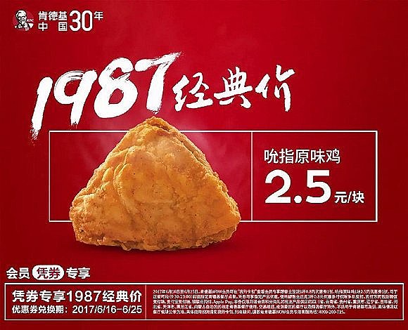 幾個月前,為了慶祝入華三十周年,肯德基將經(jīng)典產(chǎn)品吮指原味雞和土豆泥調(diào)回了1987年的價格,還重新上架了被很多人念念不忘的嫩牛五方,讓大家回歸初心。