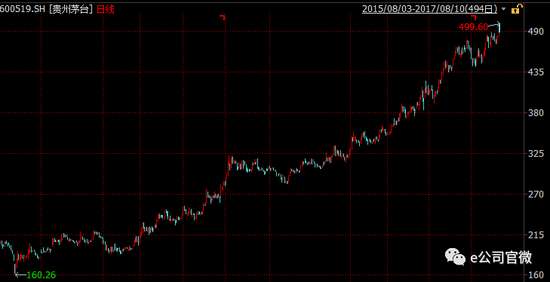特別是在近次,貴州茅臺(tái)在2015年8月25日創(chuàng)出160.26元的階段性低價(jià)后,股價(jià)開(kāi)始一路高歌猛進(jìn),先后在2015年10月23日再次突破200元、2016年7月6日突破300元、2017年4月19日突破400元,如今離500元大關(guān)僅剩臨門(mén)一腳。