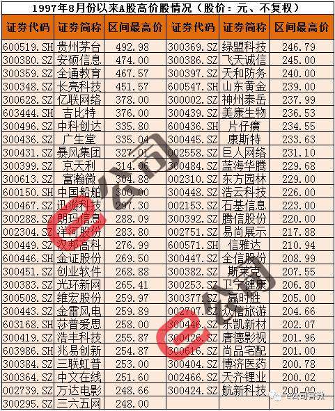 自1997年8月份以來(lái),A股共出現(xiàn)55只股價(jià)超過(guò)200元以上個(gè)股,共有360只個(gè)股股價(jià)曾破百元。只是城頭變幻大王旗,多少股票“眼看它起高樓,又眼看它樓塌了”。
