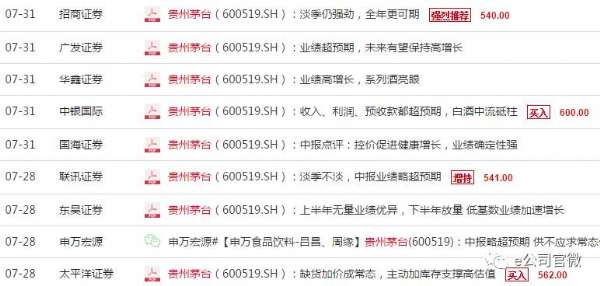 市場(chǎng)也紛紛給出貴州茅臺(tái)更高的預(yù)期,7月28日以來(lái)已經(jīng)有4家券商給予貴州茅臺(tái)強(qiáng)烈推薦或增持買(mǎi)入評(píng)級(jí),并且預(yù)計(jì)最高股價(jià)已經(jīng)達(dá)到600元。