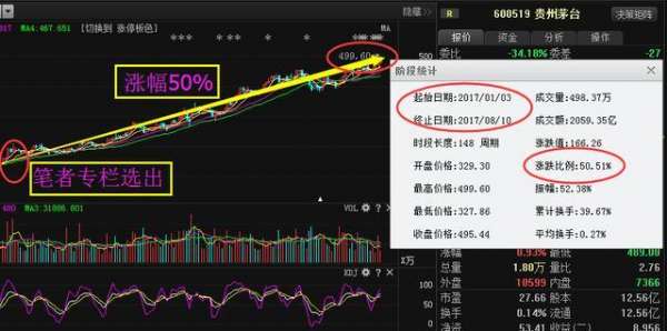 貴州茅臺(tái)是筆者年初的時(shí)候選出的金股池里面的一只,當(dāng)時(shí)貴州茅臺(tái)股價(jià)才329元,筆者當(dāng)時(shí)是看好貴州茅臺(tái)的業(yè)績(jī),以及在國(guó)內(nèi)的地位,重重利好之下,后期必定是一只會(huì)大漲的白馬股。在年初有看筆者專(zhuān)欄的金股池的粉絲朋友,都有布局貴州茅臺(tái),之后都是坐等收錢(qián),截止目前漲幅達(dá)到了50%以上。