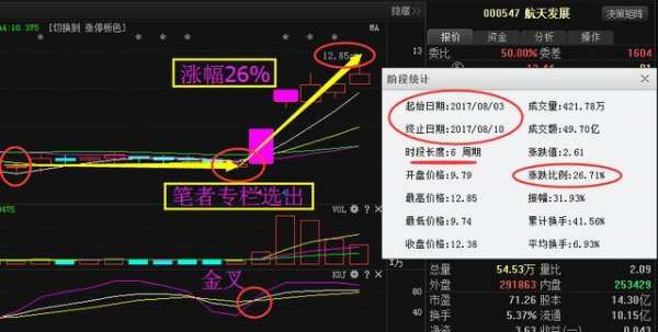 半年多以來(lái),航天發(fā)展股價(jià)一直沒(méi)上漲,但是筆者看到主力資金仍然在不斷流入,說(shuō)明這是主力在洗盤(pán),所謂橫有多長(zhǎng)豎有多高,在8月3號(hào)的時(shí)候,筆者看到主力洗盤(pán)結(jié)束,趨勢(shì)出現(xiàn)金叉,當(dāng)天3號(hào)就在筆者專(zhuān)欄里面選出了航天發(fā)展,之后大家可以看到航天發(fā)展股價(jià)一路上漲,截止目前短短6個(gè)交易日漲幅達(dá)到了26%。