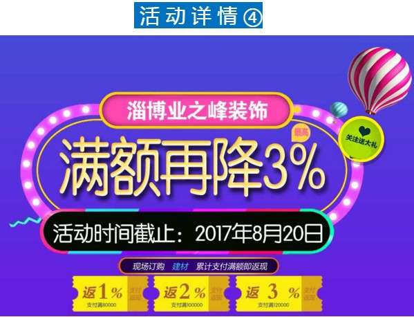 7月19日-8月20日,業(yè)之峰裝飾于淄博峰格匯旗艦店舉行15周年慶感恩回饋大型活動。整體家裝價格一扒到底、業(yè)之峰峰格匯27家主材品牌價格一扒到底,同時第二季全城300戶免費設(shè)計公益活動再次啟動,給予淄博全城的業(yè)主最大的裝修盛宴――這場“15周年慶”盛典禮單,將成為淄博業(yè)之峰本年度推出的空前感恩巨獻。