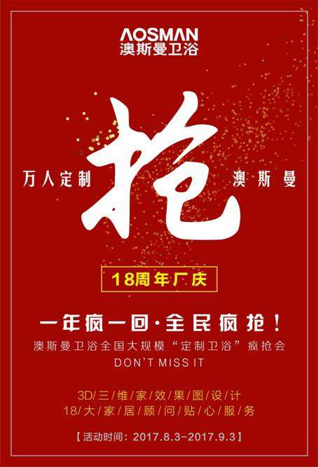 摘要:\u00A0澳斯曼18周年廠慶來襲!\u00A0\u00A0“18年僅瘋一回”的澳斯曼衛(wèi)浴全國大規(guī)模“定制衛(wèi)浴”瘋搶會,誠邀您來瘋搶!\u00A0\u00A0即日起至2017年9月3日,澳斯曼萬人定制精彩“豪禮”送不停!&……