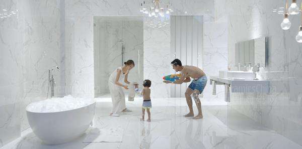 \u00A0 \u00A0 片中,一對父子躲在滿是泡泡的浴缸中,與年輕的媽媽玩起了捉迷藏,突然一起站起來用水槍掃射,媽媽配合地舉手投降,一家三口在浴室里嬉戲打鬧,其樂融融。