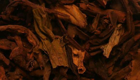 色澤黑褐帶黃褐,有一定的亮度,條索短小細碎,有梗,葉質尚柔軟、有彈性。