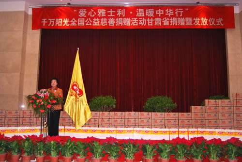 儀式上,原青海省人大副主任、省慈善總會會長杜穎發(fā)表重要講話,她說:“雅士利集團向我省少數民族地區(qū)、貧困山區(qū)兒童福利院、貧困小學捐贈價值50萬元的奶粉。你們的善行義舉、真情奉獻是對廣大兒童的最大關懷,是對慈善事業(yè)的大力支持。為了把這批愛心捐贈物資發(fā)放好、使用好,不辜負捐贈者的一片愛心,我希望各受援地區(qū)的兒童福利院、貧困小學要按照捐贈者和省慈善總會的要求,盡快將捐贈奶粉進行登記造冊,發(fā)放到位,落實到人。同時,在發(fā)放過程中要拍攝、錄取相關資料,并通過新聞媒體在社會上大力宣傳、報道中華慈善國際互聯網救助中心和廣東雅士利集團股份有限公司的善行義舉、愛心奉獻。正是他們扶危濟困、回報社會的高尚道德情操,弘揚了中華民族樂善好施的傳統美德,倡導了互助友愛、守望相助的道德風尚,也創(chuàng)造了支撐慈善事業(yè)發(fā)展的良好社會氛圍。”她說:“甘肅是一個經濟欠發(fā)達的內陸省份,同時又是一個自然災害頻發(fā)的地區(qū)。無論城鎮(zhèn)還是農村,貧困人口多,貧困面大,社會救助的任務十分繁重。眼下正值天寒地凍,也正式廣大弱勢群體最需要得到救助的時候。我們熱切期待省內外、海內外富有愛心、善心的企業(yè)家和社會各界人士為我省貧困地區(qū)奉獻愛心、傾注真情,為貧者、弱者建起生活幸福、快樂成長的天堂。”