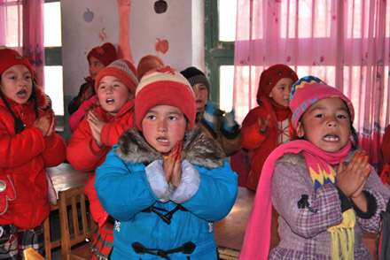巴格其鎮(zhèn)卡斯皮雙語(yǔ)小學(xué)學(xué)前班唱起歌曲歡迎雅士利愛心小組一行