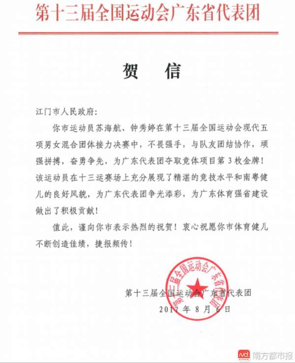 南都訊 記者嚴(yán)亮 據(jù)江門市體育局消息,8月6日,江門市運(yùn)動員蘇海航、鐘秀婷在第十三屆全運(yùn)會現(xiàn)代五項男女混合團(tuán)體接力決賽中與隊友團(tuán)結(jié)協(xié)作獲得廣東代表團(tuán)競體項目第3枚金牌,第十三屆全運(yùn)會廣東代表團(tuán)特向江門市發(fā)來賀信。