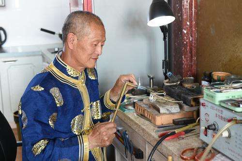 “在我學(xué)蒙古銀飾制作的時候,跟本沒跟師傅學(xué)過,全憑自己鉆研,為了偷師學(xué)藝,我經(jīng)常跑到包頭市區(qū)一些南方人開的首飾店去偷藝。因?yàn)閷@份事業(yè)的熱愛,時間長了,我就和幾個打金師傅混熟了,與他們在店里與之閑談之時,自己便留心人家是怎樣打金打銀的,回到家后,我便自己琢磨,試著做一些簡單的戒指和女式的耳環(huán),慢慢的從手工打樣到拔絲和焊接等一些做銀飾的基本功就掌握了。”紅星達(dá)爾罕老人笑著對記者說。