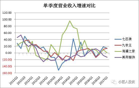 從營(yíng)業(yè)收入增速來(lái)看,自2011年以來(lái)行業(yè)增速持續(xù)下降,直到2013年底,四家公司開(kāi)始呈現(xiàn)差異,海瀾之家異軍突起,快速發(fā)展,但只維持了一年左右隨即掉頭向下。從2017年一季度情況來(lái)看,美邦的營(yíng)收還在下滑,海瀾之家保持持平,只有七匹狼和九牧王出現(xiàn)轉(zhuǎn)好跡象,營(yíng)收開(kāi)始恢復(fù)正增長(zhǎng),但是增長(zhǎng)幅度也僅是個(gè)位數(shù)。