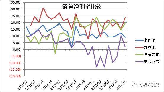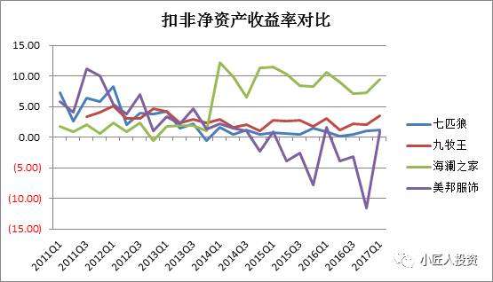 從扣非凈資產(chǎn)收益率來(lái)看,從2014年開(kāi)始,海瀾之家的凈資產(chǎn)收益率遠(yuǎn)遠(yuǎn)高于另外三家公司(具體原因后續(xù)分析中可見(jiàn)端倪),九牧王和七匹狼較為穩(wěn)定,美邦服飾波動(dòng)較大。