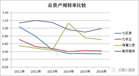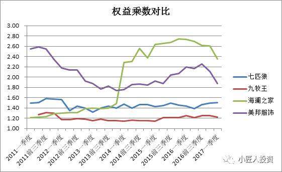 從權(quán)益乘數(shù),也就是財(cái)務(wù)杠桿來(lái)看,海瀾之家最高,美邦服飾其次,九牧王和七匹狼較低。這也一定程度上解釋了海瀾之家較高的凈資產(chǎn)收益率。