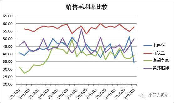 從銷(xiāo)售毛利率來(lái)看,九牧王遠(yuǎn)遠(yuǎn)高于另外三家公司,且較為穩(wěn)定;除七匹狼今年一季度毛利率下劃外,另三家公司毛利率均有所回升。