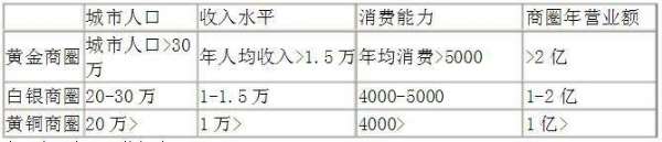 商圈等級的高低直接代表著含金量的多少。我們可以用打分的辦法來確定是黃金商圈還是白銀商圈,或是黃銅商圈。如果商圈的等級評定占總分的65%,我們可從城市人口、收入水平、消費能力及商圈的年營業(yè)額四個方面來評估。如這個城市非農(nóng)業(yè)人口為30萬,年人均收入在1.5萬元,年平均消費大于5000元,商圈的年銷售額在2億元~3億元,我們就可以把它定為具有65分值含金量的黃金商圈。一般來說,城市人口分值為10分,經(jīng)濟收入為15分,消費能力為15分,商圈年銷售額為25分(例如,這個地區(qū)有一個大型商場,商場營業(yè)額在1000 萬元算一分,5000萬元算5分等等)。當采用以上每項規(guī)定的分值進行評估時,總分為50分的便可確定為白銀商圈,如果僅有30分則定為黃銅商圈。總分:65分